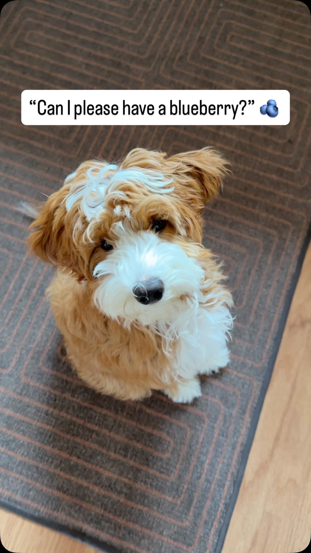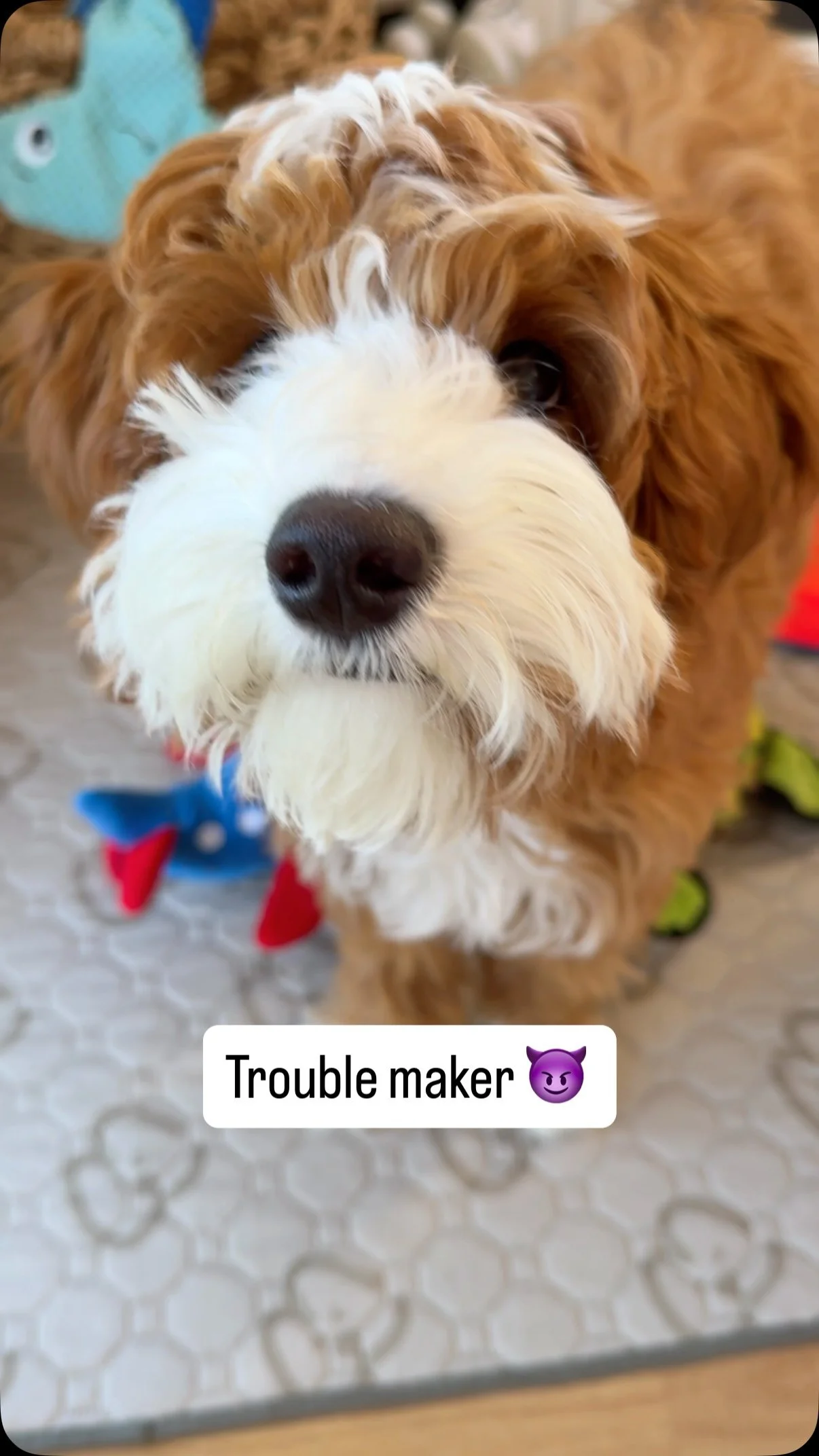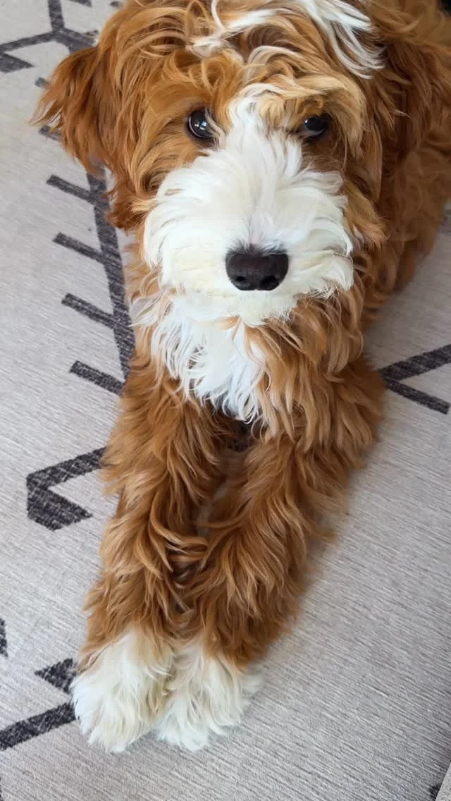 Airplane is a multi-gen mini-Goldendoodle with a red tuxedo coat. 🧥 With his poodle and golden retriever background, he doesn’t shed, is super smart, and loves being around people and other dogs. 🐕